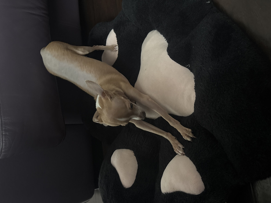 The image displays an indoor scene, stated to be in Rostov-on-Don, Russia. A small, light-brown, short-haired dog, consistent with a Chihuahua, is positioned centrally on a large, black, plush mat shaped like an animal paw print, featuring five off-white pads. The dog is captured in a stretching posture, with its forelegs extended forward on the mat, its head lowered towards its paws, and its hindquarters elevated by its extended rear legs. A dark, upholstered furniture piece, likely a couch or chair, is partially visible in the upper background. The floor beneath the mat is dark. No human subjects are present in the frame. The lighting appears to be from an indoor artificial source.