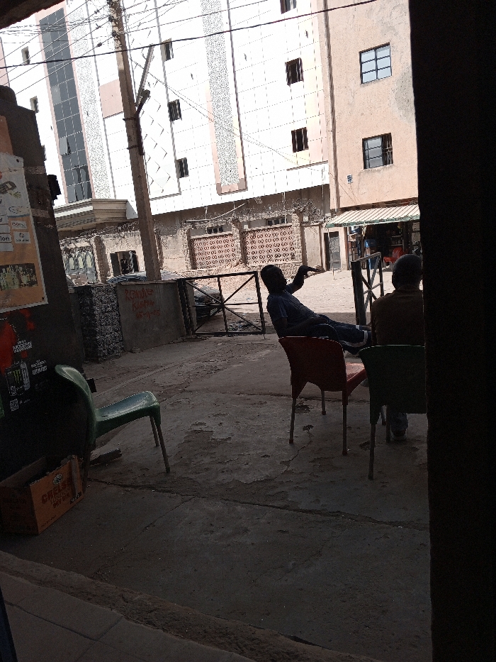 The image portrays an outdoor urban environment in Sabon Gari West, Nigeria, under direct sunlight creating strong shadows. The foreground features a worn concrete ground. On the left, an empty light green plastic chair stands near a brown cardboard box labeled "CRELEL DRY GIN." In the mid-ground, two individuals are seated on plastic chairs. The leftmost individual, a male, wears a dark blue shirt and dark trousers, sitting on an orange chair with his right arm raised and bent, and his left leg extended. To his right, a second individual, largely shadowed and seen from behind, wears a light brown shirt and is seated on a dark green plastic chair. A black metal barrier with diagonal bracing extends across the mid-ground behind the seated figures. In the background, a tall multi-story building with white and brown paneling and multiple dark windows dominates the left and center. To its right, a simpler beige building with square windows is visible. A patterned concrete wall runs along the base of these buildings. A utility pole with overhead wires is positioned between the foreground and background structures. On the far right background, a small shop or stall with a green and white striped awning is visible.