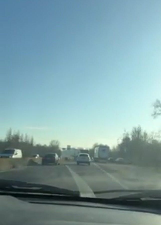 car driving on a highway on a sunny day. Other cars are visible on the road ahead, along with a large truck. Trees line both sides of the highway. The sky is clear and blue. The dashboard of the car filming is visible at the bottom of the frame.