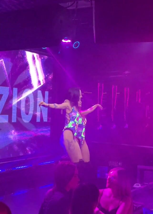 woman dancing on a stage in a nightclub. The stage is illuminated by blue and purple lights. The background features an LED display that reads "LUZION". The dancer is wearing a colorful leotard and knee-high boots. She is performing in front of a crowd of people, whose faces are mostly obscured. The nightclub environment includes visible sound equipment.