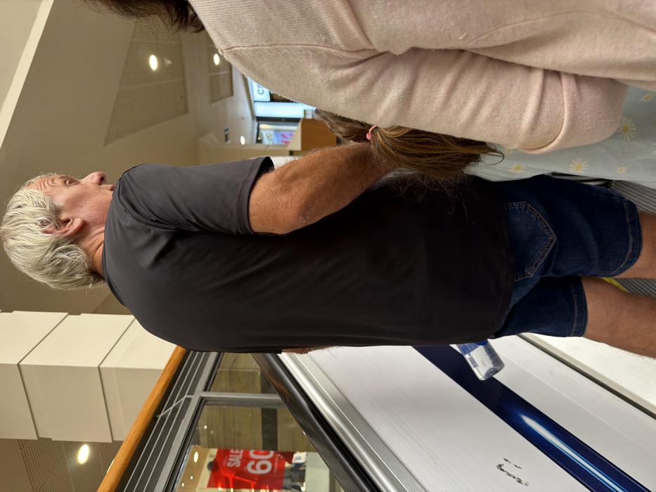 An eye-level shot captures an older man with gray hair, wearing a black t-shirt and denim shorts. Next to him is a person with long brown hair in a ponytail, wearing a light pink sweater. A water bottle is on a white surface next to the man. A clothing store is visible through a glass window, with a red shirt labeled "SALE 60" displayed. The scene takes place indoors, possibly a mall.