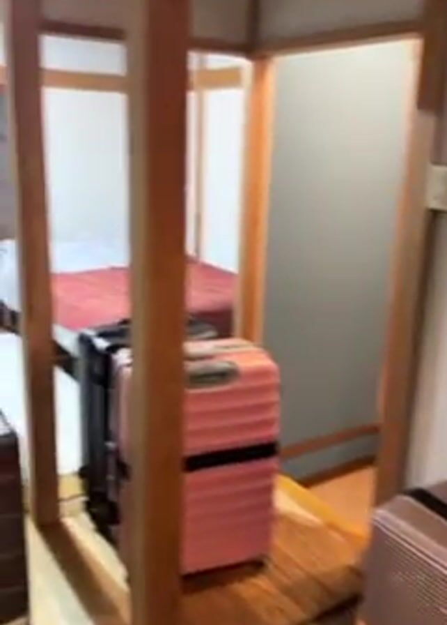 room in what appears to be a Japanese-style house or inn. The camera first focuses on a cluster of suitcases, including one pink, one bronze with orange straps, and two darker ones. The camera then pans to the left, revealing a woman wearing a white top and black pants unpacking some of her belongings on a small table or surface. A light-colored dog is also visible in the frame. In the background, there is a room with a bed, covered with red and white linen. The room is separated by wooden beams and a traditional shoji screen. The caption in the video reads, "Finally arrived my short."