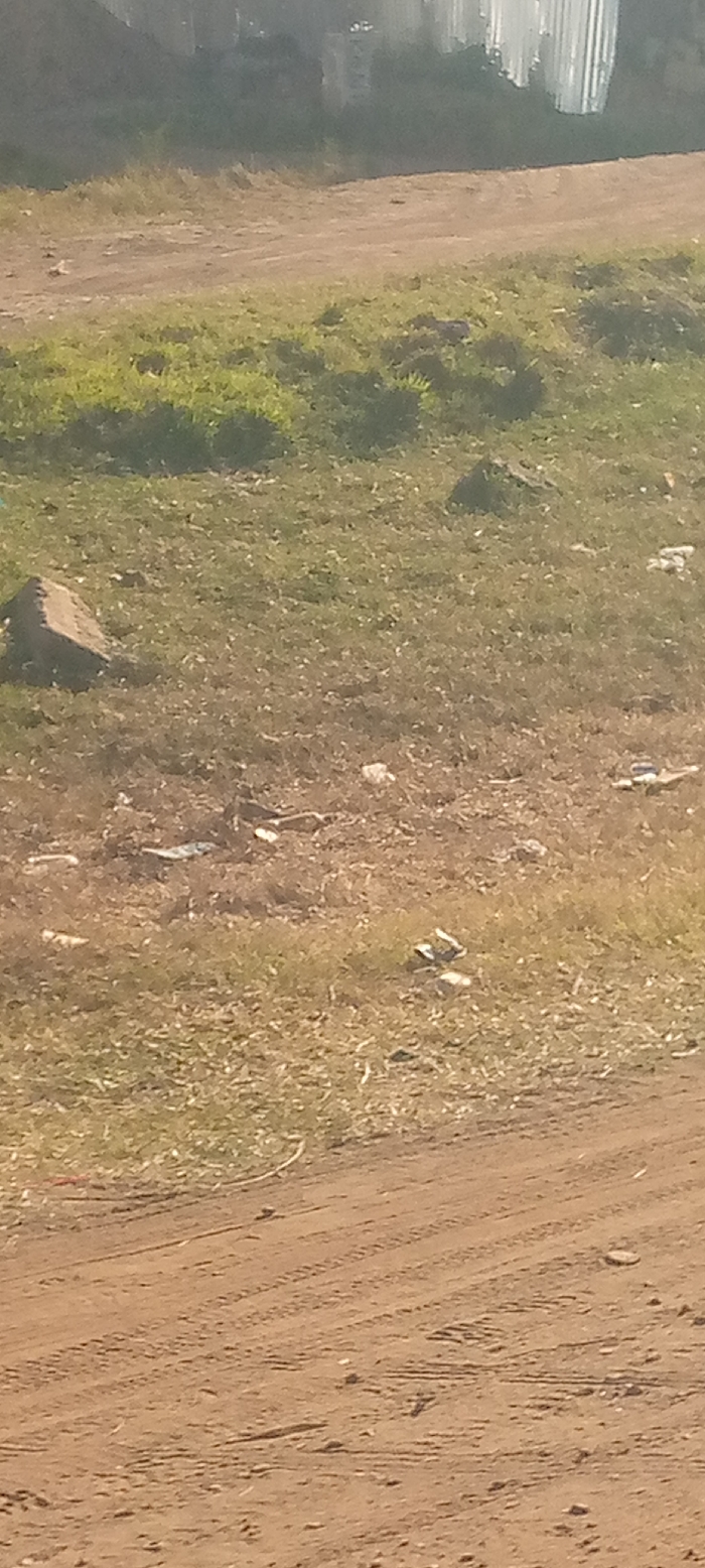 A ground-level shot depicts a dirt road with visible tire tracks in the foreground. Beyond the road, a field of sparse grass and patches of brown earth is dotted with scattered litter. A medium-sized rock sits amidst the vegetation to the left. In the distance, indistinct buildings or structures are blurred. The overall scene suggests a rural or undeveloped area.