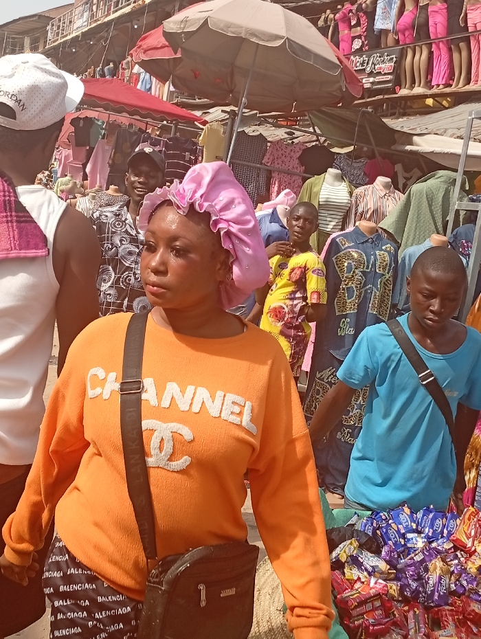 An outdoor market scene in Fegge, Nigeria, depicts multiple individuals amidst clothing stalls and merchandise displays under bright daylight. In the foreground, a woman with visible facial perspiration wears an orange long-sleeved sweatshirt with "CHANNEL" and the Chanel logo embroidered in white. She has a ruffled pink satin bonnet with clear rhinestones on her head and a black shoulder bag with a dark strap across her body. Her lower garment is black with repeating white "BALENCIAGA" text. To her immediate left, a person, partially visible from the back, wears a white baseball cap with "JORDAN" printed on it and a white tank top over a pink plaid garment. In the mid-ground, to the left of the central woman, a young male wearing a black baseball cap and a black and white patterned shirt smiles towards the camera. Further right, another young male in a yellow and red patterned shirt is visible. To the far right, a young male in a light blue t-shirt with a black shoulder bag looks down at a display of packaged snacks, including "TOP" and "Fabi" brands. The background features numerous mannequins displaying various items of clothing, including shirts, dresses, and pink form-fitting garments. Several large market umbrellas, one brown/beige and one red, provide shade. Multi-story buildings with various windows and balconies rise behind the market stalls, suggesting an urban setting. The overall environment is bustling with market activity and pedestrian traffic.