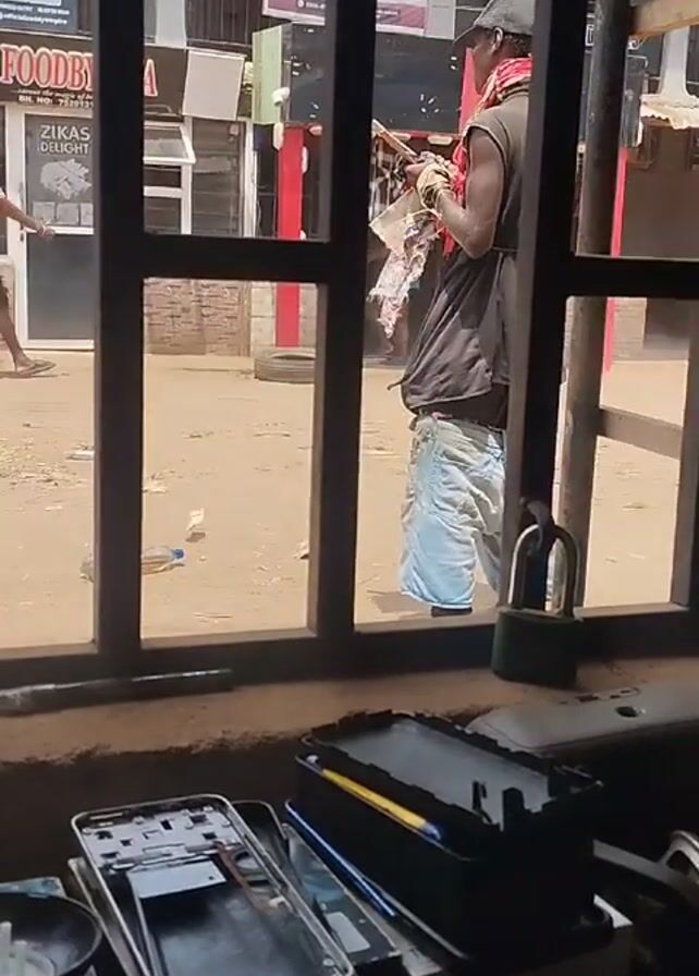From behind bars, the scene reveals a street bustling with activity. A man in a cap and scarf stands just outside, looking at a phone. People walk past, and a motorcycle is parked nearby with two people on it. In the foreground, there are electronic components and a padlock, suggesting the view is from inside a repair shop or similar business. Banners and storefronts are visible across the street.