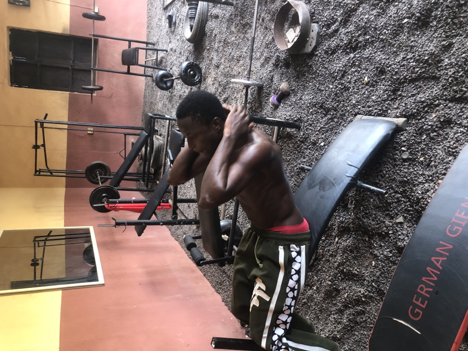 A shirtless, muscular man in green and white track pants is seated on a black bench. He is holding his hands behind his head, possibly stretching or resting between sets. The setting appears to be an outdoor or partially outdoor gym. Various weightlifting equipment is visible including barbells, a squat rack, and a mirror. The ground is covered in small gray gravel. A black board with text "GERMAN GIEN" can also be seen.