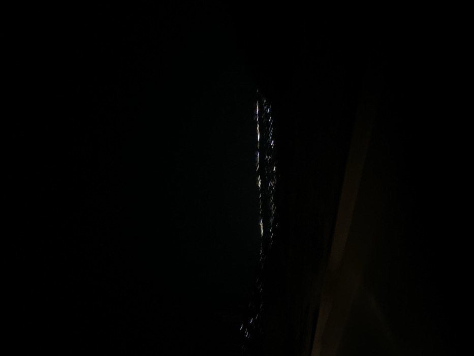 The image presents a nighttime, high-angle view of the city of Al-Hama, Syria. The scene is predominantly dark, with a horizontal band of numerous blurred artificial lights extending across the mid-ground, indicating a distant urban area. These lights appear as elongated streaks, primarily white and yellow, suggesting motion blur. The foreground is largely obscured by darkness, with a faint, indistinct diagonal line present in the lower-left quadrant, possibly a surface or structure. The sky above is uniformly black and featureless. No specific individuals, identifiable structures beyond the general city illumination, or actions are discernible within the frame.