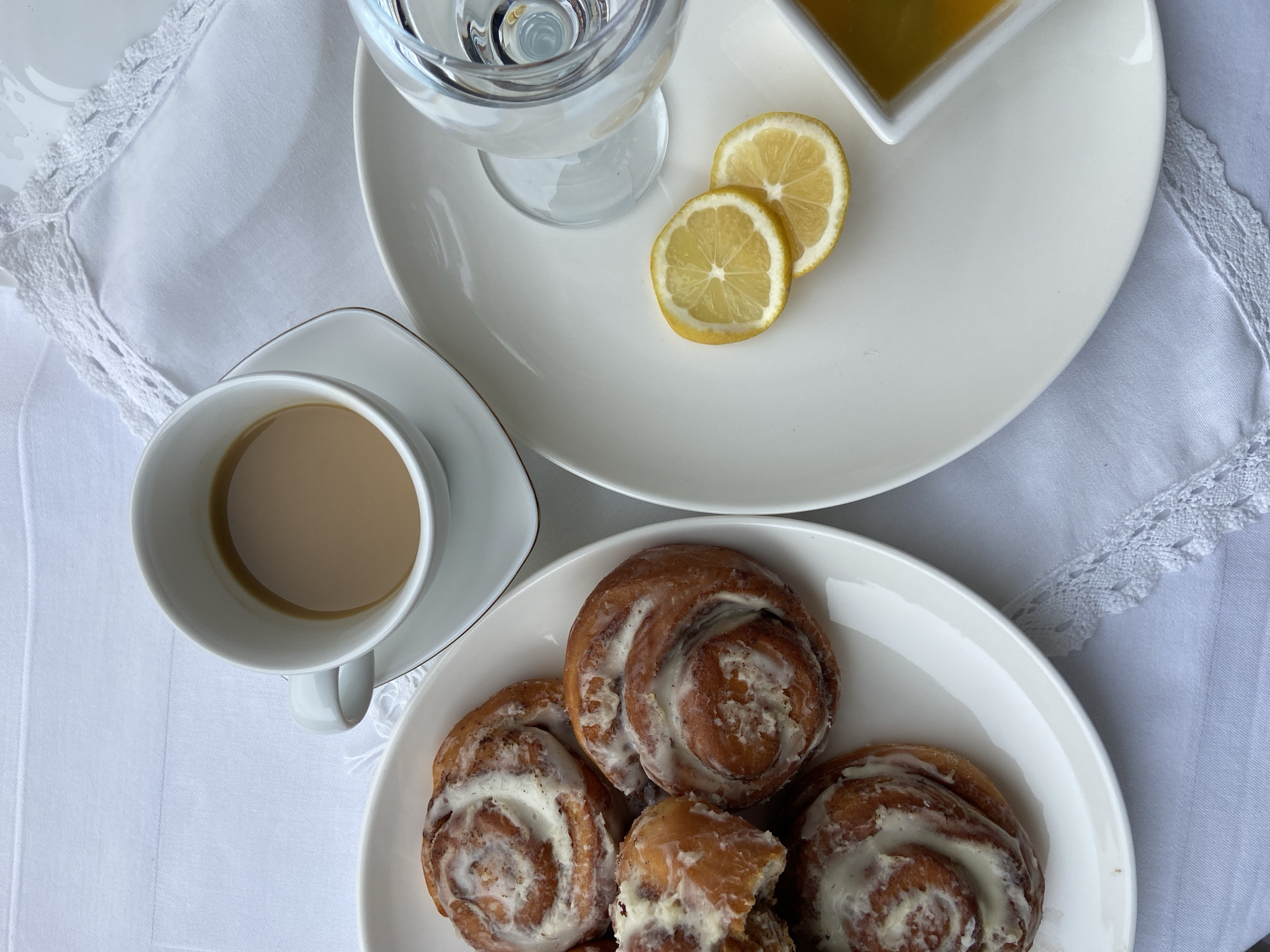 breakfast setting on a white tablecloth with lace edging. A plate holds several cinnamon rolls with icing. To the left, there is a cup of coffee on a saucer. A second plate contains a glass of water, two lemon slices, and a square dish filled with yellow liquid, possibly honey or jam. The location is not discernible from the image. There are no people visible in the image.