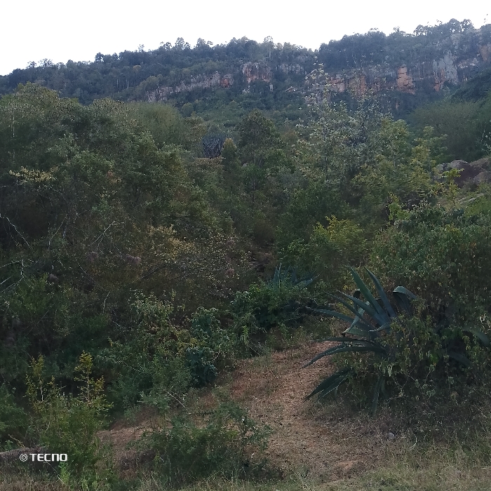 A landscape of dense greenery slopes upward, culminating in a rocky cliff topped with a line of trees. Various shades of green dominate the foreground, indicating diverse plant life. A dirt path meanders through the vegetation, leading towards the higher terrain. In the lower right, an agave plant with prominent leaves is visible. The overall scene suggests a natural, possibly mountainous, environment.
