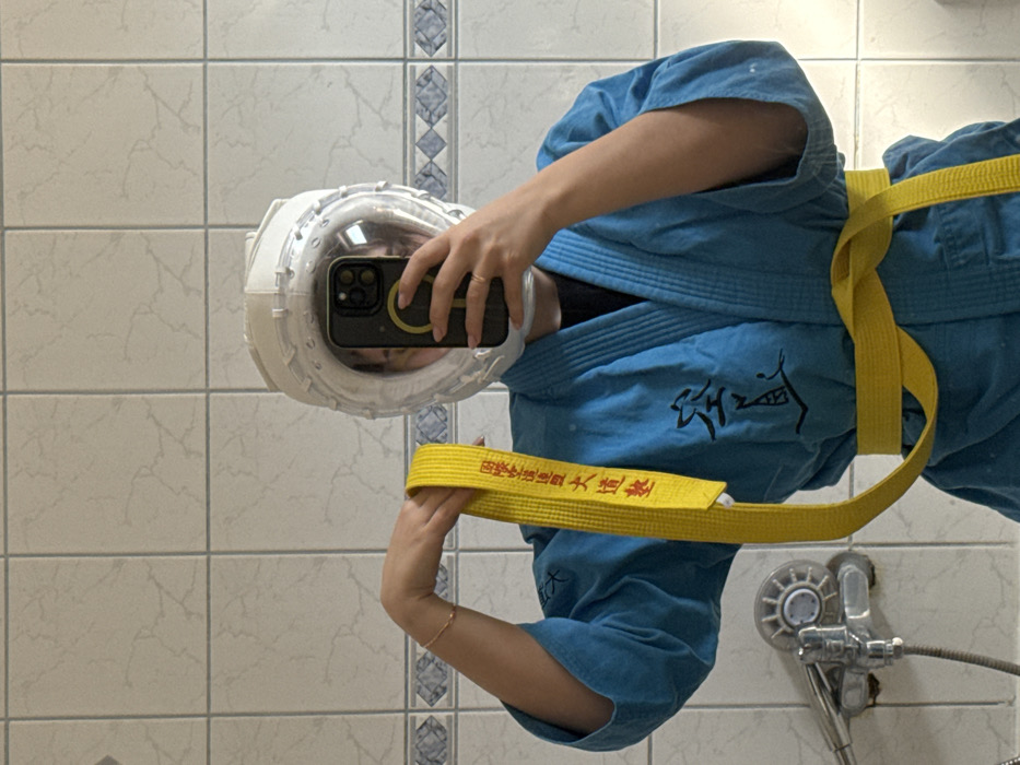 The image depicts an individual taking a mirror selfie in a bathroom, identified as being in the city of Hainburg an der Donau, Austria. The background consists of light-colored, square ceramic wall tiles with faint grey veining, horizontally segmented by a band of decorative tiles featuring a blue and white geometric pattern. A chrome shower mixer tap and a flexible hose are visible on the lower-left side of the frame. The individual is wearing a white martial arts sparring helmet with a clear face shield, which covers their head. A blue martial arts uniform (gi) is worn, featuring black Kanji characters, specifically "空道" (Kudo), on the left chest area. A yellow martial arts belt is tied around the individual's waist. The individual's right hand, adorned with a thin, light-colored bracelet, holds a segment of the yellow belt upwards, revealing red embroidered Kanji characters which read "国際空道連盟大道塾" (Kokusai Kūdō Renmei Daido Juku - International Kudo Federation Daido Juku). The individual's left hand holds a dark-colored smartphone with a yellow circular magnetic attachment on its back, positioned to obscure the individual's face in the reflection. The scene captures the individual standing and photographing their reflection in a mirror.
