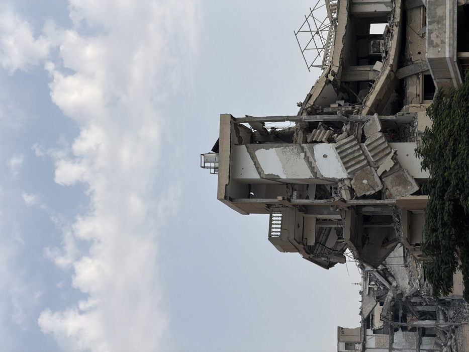 The image depicts a scene of extensive structural damage to multi-story buildings in Gaza, Palestinian Territory