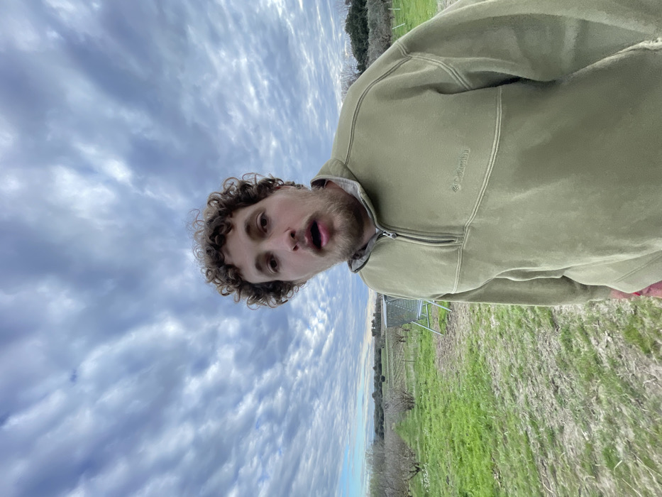 The image displays a male subject in a rural, agricultural environment in Cucuron, France. The man, positioned centrally in the foreground, has curly brown hair and a light beard, looking directly at the camera with his mouth slightly agape. He wears an olive-green Columbia quarter-zip fleece pullover. A small red object or fabric is visible near his lower left side. Behind him, to the left, is a silver-toned, open-top metal utility cart on wheels. The background consists of a field with green grass and visible dirt paths, lined with rows of what appear to be dormant fruit trees or bushes. The sky is largely covered by a pattern of alto-cumulus clouds.