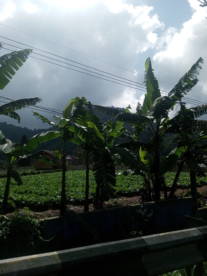 The image displays an agricultural landscape in Kandapola, Sri Lanka. The scene is dominated by a partially cloudy sky, exhibiting both dark grey storm clouds and patches of bright blue sky with white cumulus clouds. Multiple dark, horizontal utility lines stretch across the upper-mid section of the frame. In the background, a dark, tree-covered mountain range rises under the cloud cover. The midground features several banana trees with large, green leaves, some appearing wind-torn, forming a line in front of a vast, cultivated field. This field contains numerous rows of densely planted, small, leafy green crops, consistent with a vegetable farm. Beyond the field, a light-colored wall or fence runs horizontally, behind which a few distant residential structures with light-colored walls and dark roofs are partially visible. Below the crop field, a dark blue-grey concrete retaining wall or barrier extends across the lower-midground, with some dark green foliage growing on and around it. The immediate foreground shows a dark grey metal guardrail with a distinct light-colored horizontal stripe, indicating the perspective is from a roadside. No people or active interactions are visible within the frame.