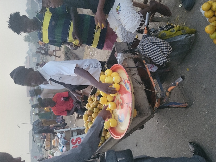 A street vendor is selling yellow oranges in a metal wheelbarrow with a red and pink tray. Two men stand by, one peeling an orange. Other people are visible in the background, along with cars and various items for sale. The sky is hazy, suggesting dawn or dusk. A person's legs and shoe appear in the foreground.