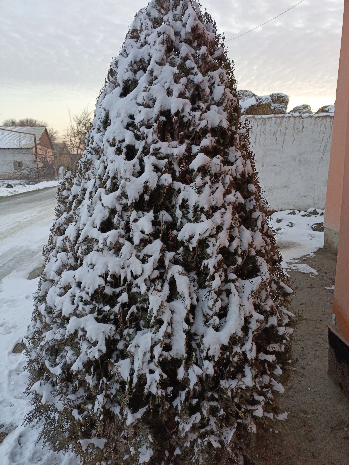 The image depicts a winter scene in the city of Qoraqosh, Uzbekistan. A prominent, conical evergreen tree, heavily laden with white snow, dominates the foreground and center. The snow adheres to the tree's branches, forming thick, distinct layers. To the immediate left of the tree, a snow-covered asphalt or paved road with visible tire or foot impressions recedes into the background. Beyond the road, several buildings are visible: a light-colored structure with a dark roof in the mid-ground and a reddish-pink building further back. Bare tree branches are scattered throughout the left background. To the right of the central tree, a low, light-colored wall is present, topped with several large, cylindrical bales of hay or straw, also dusted with snow. The ground near the wall consists of a dirt path partially covered by snow. A reddish-pink building or architectural element is partially visible on the far right edge of the frame. The sky is overcast with diffused light, showing light grey clouds transitioning to a faint yellowish-orange hue near the horizon, suggesting either dawn or dusk. No people, actions, or interactions are present in the scene.