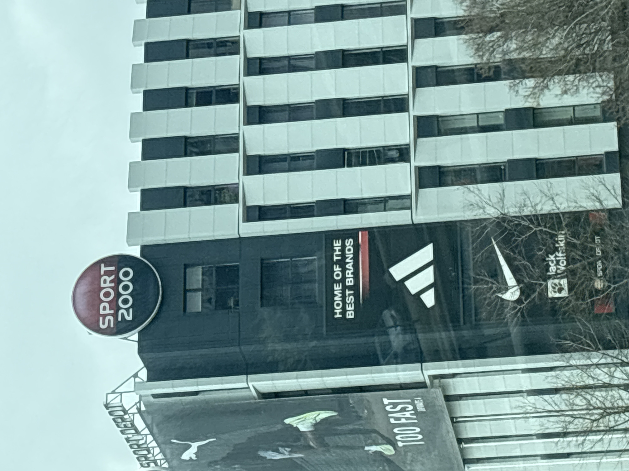 building facade with prominent advertisements for sports brands in Sofia, Bulgaria. A circular "Sport 2000" sign is visible on the upper left, attached to a section of the building featuring the phrase "HOME OF THE BEST BRANDS." Adjacent to this, the logos of Adidas, Nike, and Jack Wolfskin are displayed. A large Puma advertisement with the slogan "TOO FAST DEVIATE 4" is positioned lower on the building's facade. The building itself has a distinct pattern of alternating white and dark horizontal bands. Bare tree branches are visible in the foreground, partially obscuring the lower right of the advertisement.