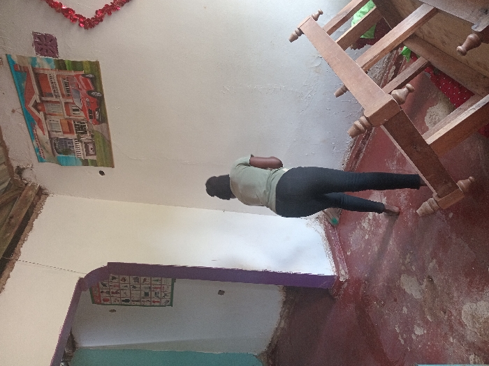 This image depicts an interior room within the Manda-Shivanga ward, Kenya. The room features white-painted walls exhibiting wear, with patches of exposed concrete or plaster near the ceiling and floor. An arched doorway with a purple-painted frame leads to an adjacent space with a light turquoise wall, where an educational chart is affixed. The floor is red-painted concrete, heavily scuffed and covered with scattered light-colored debris. The ceiling structure consists of visible unfinished wooden beams. A single individual, female, is seen from the back, bending forward toward the wall or floor. She wears a light olive-green short-sleeved top, dark-colored trousers, and light-colored flat shoes. On the right wall, a poster depicting a large modern house with a red SUV parked in front is displayed. A red decorative element, possibly tinsel, is partially visible to the right of the poster. In the foreground, a wooden bed frame with turned posts lies on its side, positioned across the floor. The scene suggests a process of cleaning, rearrangement, or renovation is underway.
