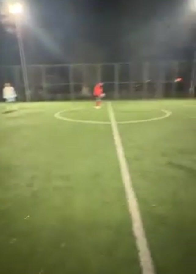group of people on a well-lit outdoor soccer field at night. The field is surrounded by a chain-link fence, and there is a soccer goal at one end. The camera is initially pointed toward the field, then lowers to show the feet of the person holding the camera, which are clad in bright red soccer cleats. The camera then pans back up to show a group of people interacting around the soccer goal.