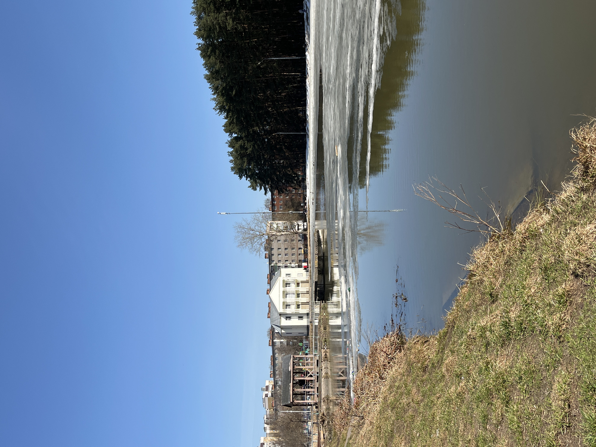 The image depicts a waterfront scene in Podolsk, Russia. A body of water, likely a river or canal, reflects the buildings and structures on the opposite bank. The water surface is partially covered with ice or slush. The buildings include multi-story residential structures, some painted white. A line of trees borders the water, providing a backdrop to the urban landscape. The foreground features a grassy bank with patches of dry vegetation, suggesting an early spring season. There are light poles visible. The sky is a clear, bright blue, indicating fair weather conditions.