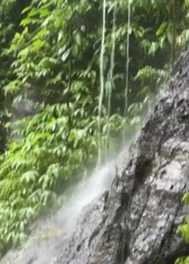 waterfall in a lush, green environment. The camera pans up from a small, rocky cascade to reveal a larger, double waterfall cascading into a pool below. The surrounding area is covered in dense foliage.