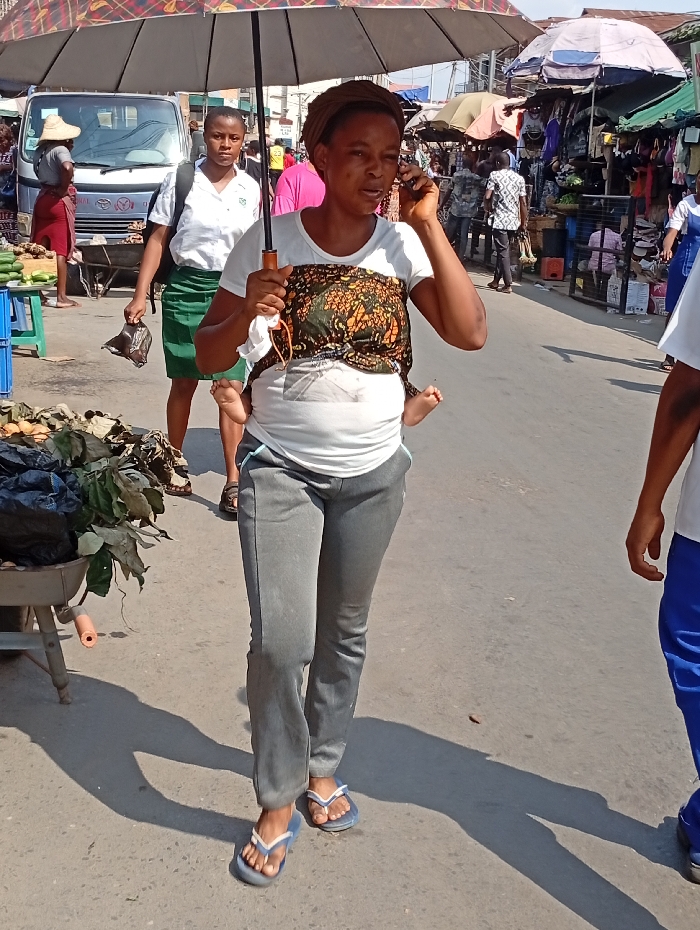 - "A woman with a baby in a carrier walks in a street market, holding an umbrella and talking on a cell phone" by FM-KfFGa2, licensed under CC BY 4.0