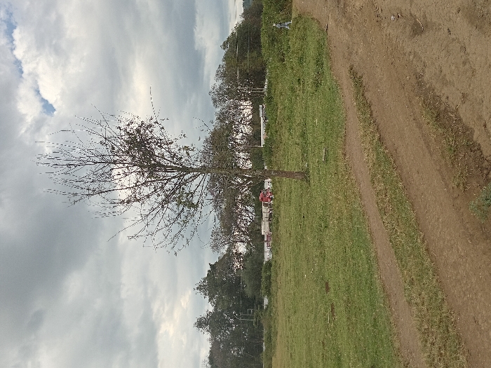 The image depicts an open, semi-vegetated area within the City of London ward, Kenya, under a predominantly overcast sky. A prominent, tall, slender deciduous tree with sparse brown foliage and visible seed pods stands centrally in the midground. In the foreground, a two-track dirt path extends from the lower right corner, curving slightly towards the left, with patches of green grass growing between the tracks. To the left of the central tree, a flat expanse of green grass covers the ground. To the right of the foreground path, the ground is covered with more uneven, overgrown vegetation. In the far midground, to the right, a lone individual, dressed in light-colored clothing (a light-toned tunic and trousers), walks along a dirt path or road that recedes into the background. In the distant background, behind a line of trees, several white structures, possibly fencing or temporary buildings, are visible. A distinct red vehicle, likely a truck, is positioned among these structures, slightly to the left of the central tree. The sky is largely covered by grey, heavy clouds, with a small section of brighter cloud or blue sky visible in the upper right quadrant. The overall lighting is diffused.