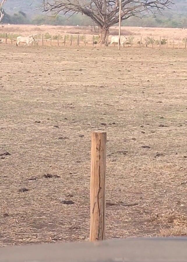 rural landscape, with a dry, grassy field bordered by a wooden fence. In the distance, there are two white animals, possibly cattle, grazing near a large, bare tree. A wooden post is visible in the foreground. The sky is overcast, and a mountain range can be seen in the background. There is a sound of a vehicle passing.