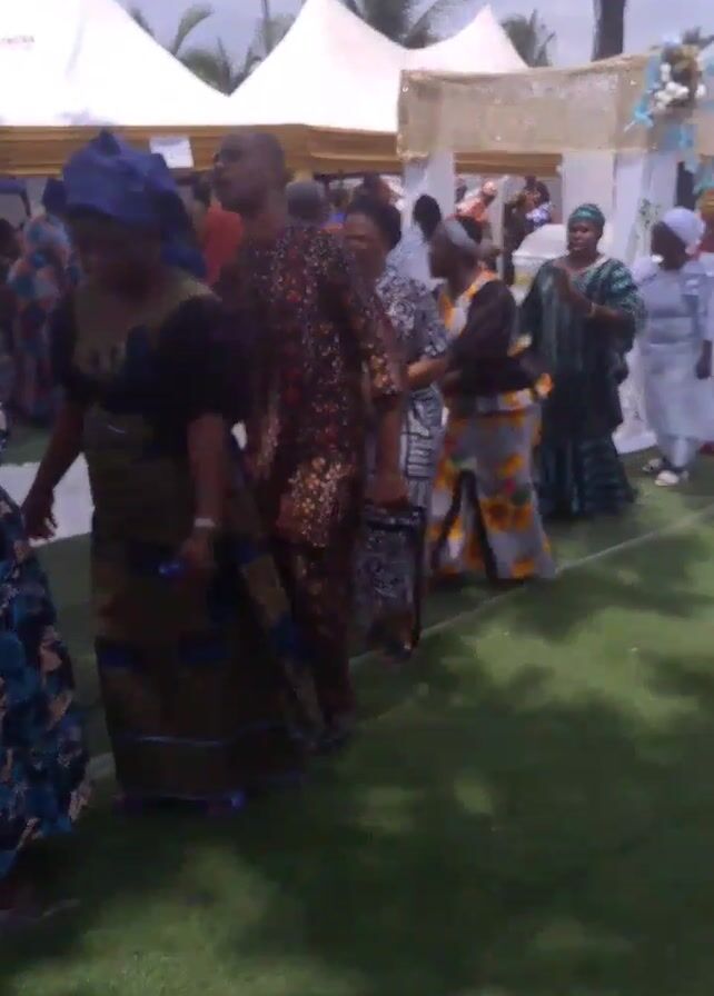 line of people dancing or swaying to music at what appears to be an outdoor event. Many of the people are wearing vibrant, colorful, patterned clothing, and some have head coverings. The group moves towards the right of the frame. Behind the dancing group, there are several white tents and a decorated structure, possibly an archway, which suggests the event might be a wedding or similar celebration. The ground is covered in artificial turf. Palm trees are visible in the background, indicating a warm climate. The lighting is bright, suggesting it's daytime.