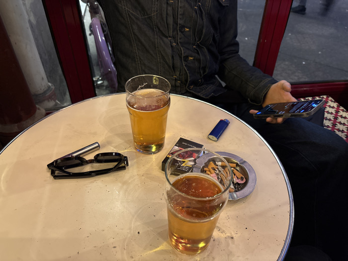 A round, white table holds two glasses of beer, a pack of cigarettes, an ashtray filled with cigarette butts, a silver case, and a blue lighter