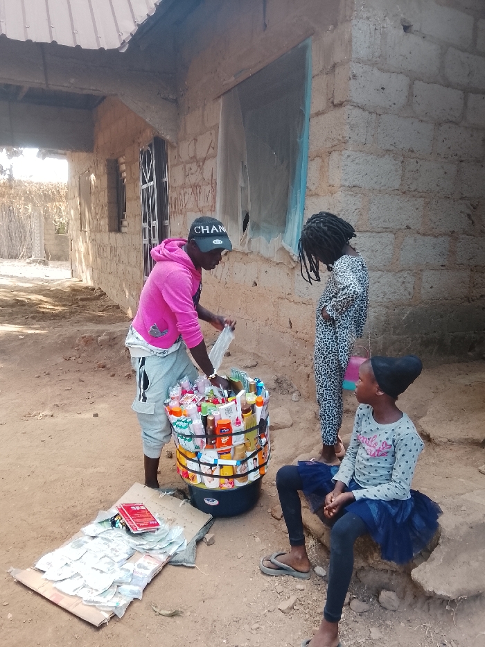 The image depicts an outdoor commercial transaction scene in Akwanga, Nigeria
