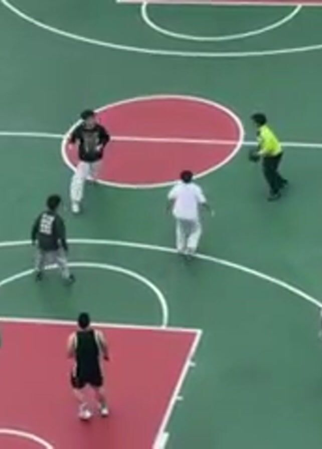 basketball game on an outdoor court. There are seven people visible, all seemingly young men. One man wears a bright yellow jacket and stands near the center circle, seemingly observing rather than actively playing. Another man, wearing white clothing, attempts a jump shot. The remaining five players are dispersed around the court, some wearing athletic jerseys and others in casual attire. One player dribbles the basketball near the left side of the screen. The court is green with red rectangular areas near the hoops. White lines mark the boundaries and key areas of the court. The overall shot is taken from an elevated perspective, providing a comprehensive view of the scene.