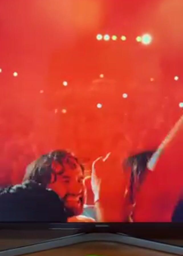 A TV displays a scene with a crowd of people illuminated by red light, possibly at a concert or event. One man stands out in the center, smiling broadly with visible excitement. Below the TV, on a wooden surface, sits a small, green toy car.