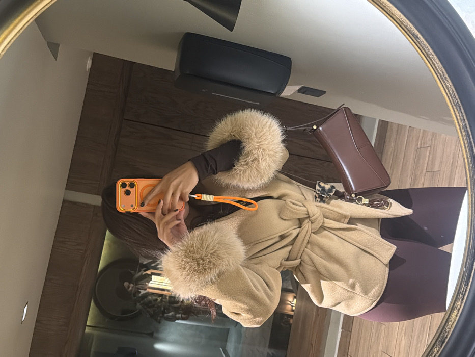 Reflection in a round mirror reveals a person taking a selfie with an orange phone. The individual wears a tan, fur-trimmed coat and dark leggings. A brown purse with a decorative keychain sits beside them. The background includes a dark wooden cabinet, a black air conditioner, and neutral-colored walls. The mirror's frame is dark and ornate.