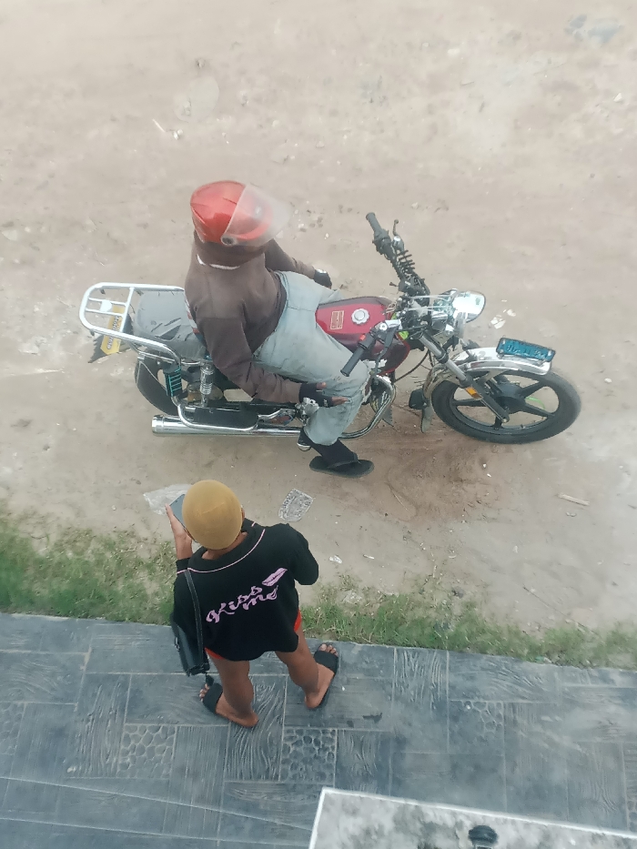 The scene, located in Igrwre-Ovie, Nigeria, presents an outdoor view from a high angle, showing a dirt ground area alongside a dark gray tiled walkway with a wood-grain pattern. Sparse green vegetation is visible on the edge of the dirt. A person is seated on a red motorcycle, oriented towards the left side of the frame. This individual wears a brown long-sleeved top, light-colored pants, black socks, and black flip-flops. A red full-face helmet with a clear visor in a raised position covers their head, and black gloves are visible on their hands. The motorcycle is red with chrome elements, including the exhaust pipe, front fender, and mirrors. It has a black seat, a chrome rear luggage rack with a partially visible yellow license plate, and black multi-spoke alloy wheels. A blue and white rectangular license plate is attached to the front fender. On the tiled walkway, a second person is observed from behind, facing the dirt area and the motorcycle. This individual wears a black short-sleeved shirt with a pink "Kiss me" graphic and pink trim, light-colored shorts, and black flip-flops. They have a light yellow or tan cap on their head and are holding a dark-colored smartphone with both hands, looking down at the screen. A black shoulder bag with a strap hangs from their left shoulder. Scattered pieces of white plastic or paper debris are present on the dirt ground between the two subjects.