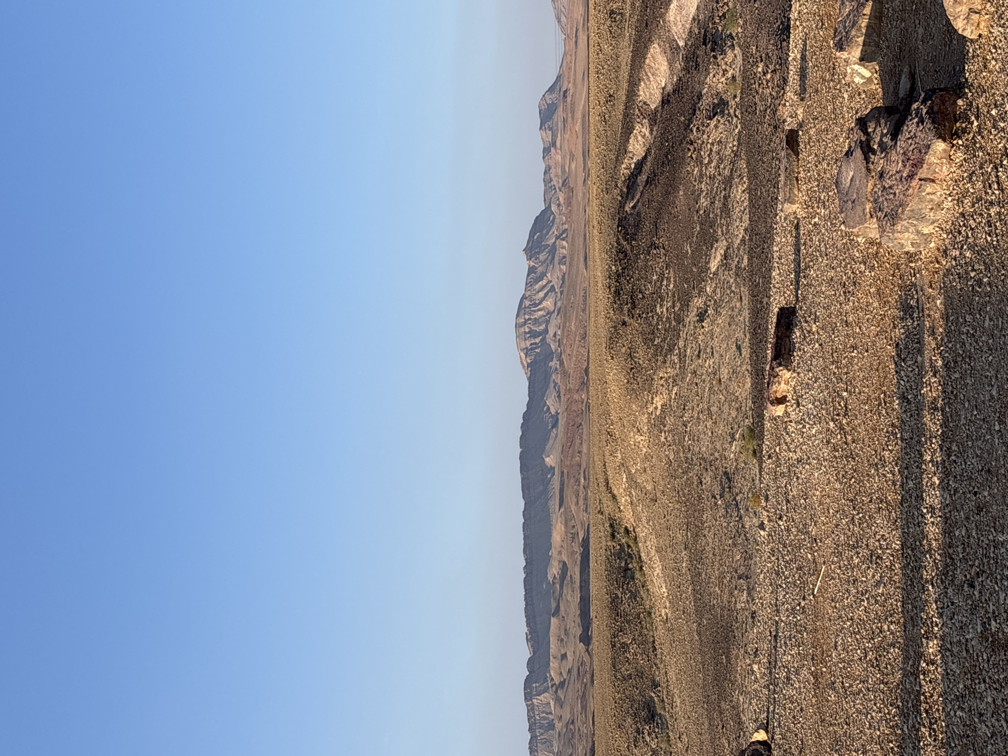 The image displays a wide panoramic view of a desert landscape under a clear, light blue sky, consistent with the environment around Mizpe Ramon, Israel. The foreground consists of a densely packed, light brown gravel and pebble surface, interspersed with scattered larger rocks exhibiting dark brown and purple-red coloration, casting elongated shadows from a low-angle sun. The midground features undulating, arid terrain with varying shades of tan, brown, and darker, possibly volcanic, rock formations, sparsely covered by low, scrubby vegetation. Further into the midground, a distinct, darker, eroded path or track is visible. In the background, a long, prominent ridge of layered, rugged mountains or mesas stretches horizontally across the horizon, with several distinct peaks and undulating contours. Beyond this ridge, fainter, more distant mountains are visible, blending into the atmospheric haze. No individuals, vehicles, or structures are present in the scene. The overall lighting suggests either early morning or late afternoon.