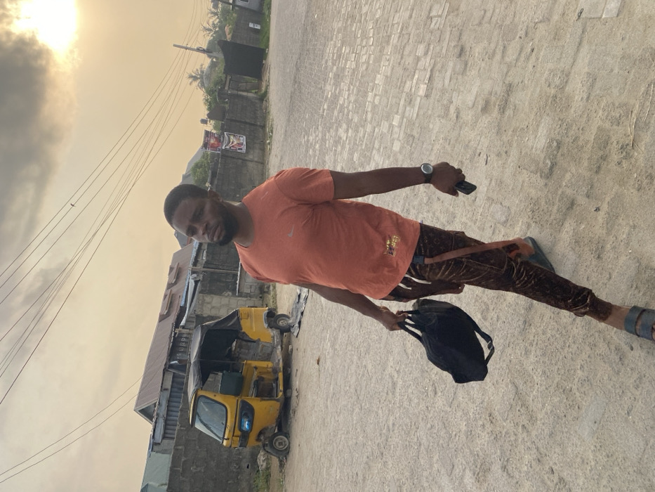 A man with a black bag stands outdoors on a textured surface. He wears an orange t-shirt, dark patterned pants, and sandals. A yellow, three-wheeled vehicle is parked in the background near a building. The sky is overcast with a bright spot that could be the sun. Utility poles with wires stretch across the top left corner. A watch is visible on the man's wrist, and he holds a mobile phone in his right hand.