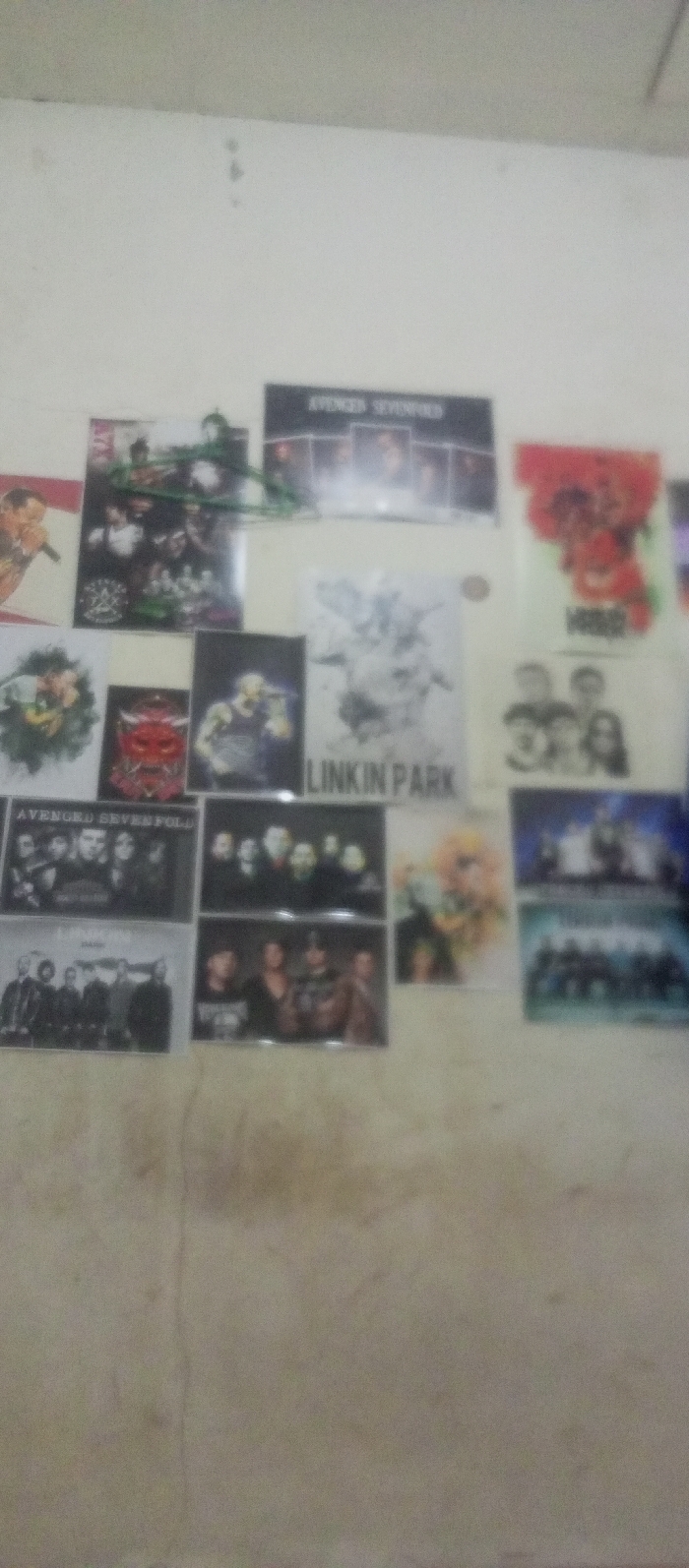 A wall is covered with various band posters. Bands visible include Avenged Sevenfold, Linkin Park, and Muse. One poster has a red and black color scheme, and another features a white and black graphic. The posters are arranged in a haphazard, collage-like fashion. A green clothes hanger is placed above some of the posters. The wall is a muted beige color with some minor imperfections.