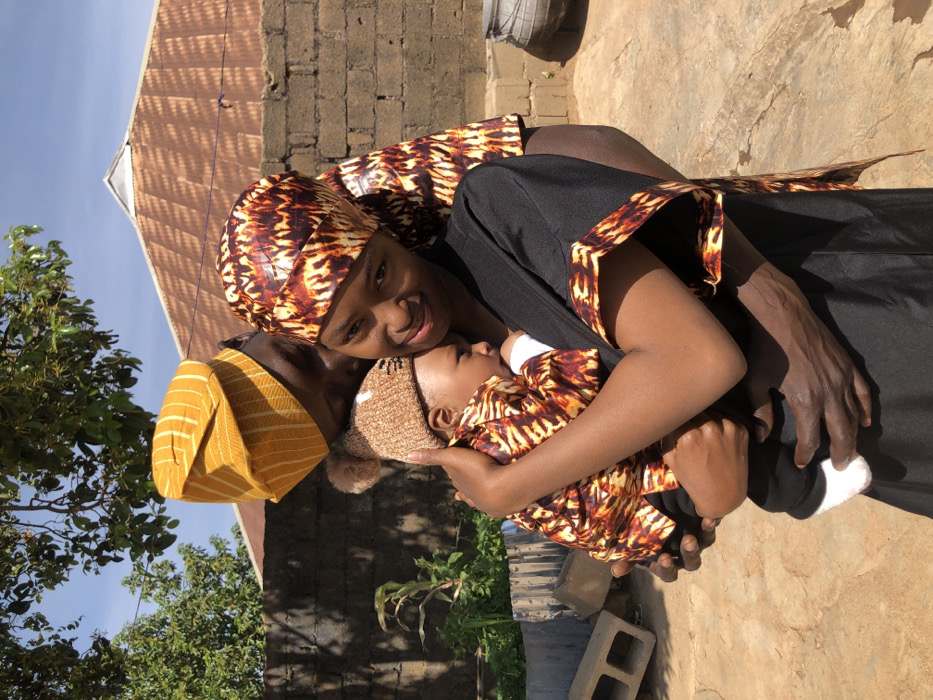 An outdoor scene in Jos, Nigeria, depicts three individuals: an adult female, an infant, and an adult male, illuminated by bright daylight under a clear blue sky