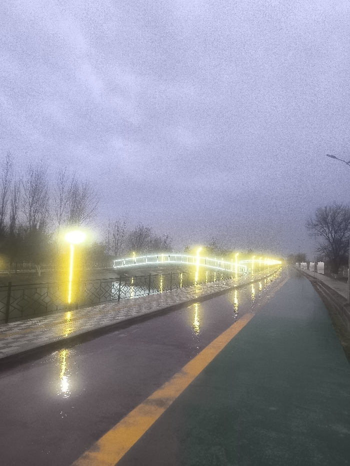 The image displays an urban park or promenade area in Pakhtakor, Uzbekistan, at dusk or night, under an overcast, light grey sky. The ground surfaces are wet and highly reflective, indicating recent precipitation. The foreground features a wide paved area, segmented by a prominent yellow diagonal line. To the left is a dark grey asphalt-like path, reflecting bright yellow light. To the right, a narrower green-paved path is also wet and reflective. Adjacent to the left path is a tiled pedestrian walkway with a checkered pattern, bordered by a dark metal fence with decorative diamond and criss-cross elements. Beyond the fence lies a body of water, likely a canal or river, reflecting the surrounding lights. Along the far bank, multiple tall, yellow-illuminated streetlights are active. A pedestrian bridge arches over the water, its railings adorned with cool-toned white LED strip lighting. The background consists of numerous bare-branched deciduous trees, silhouetted against the sky on both sides of the scene. A streetlamp pole is visible on the far right. No individuals, vehicles, or specific activities are present.