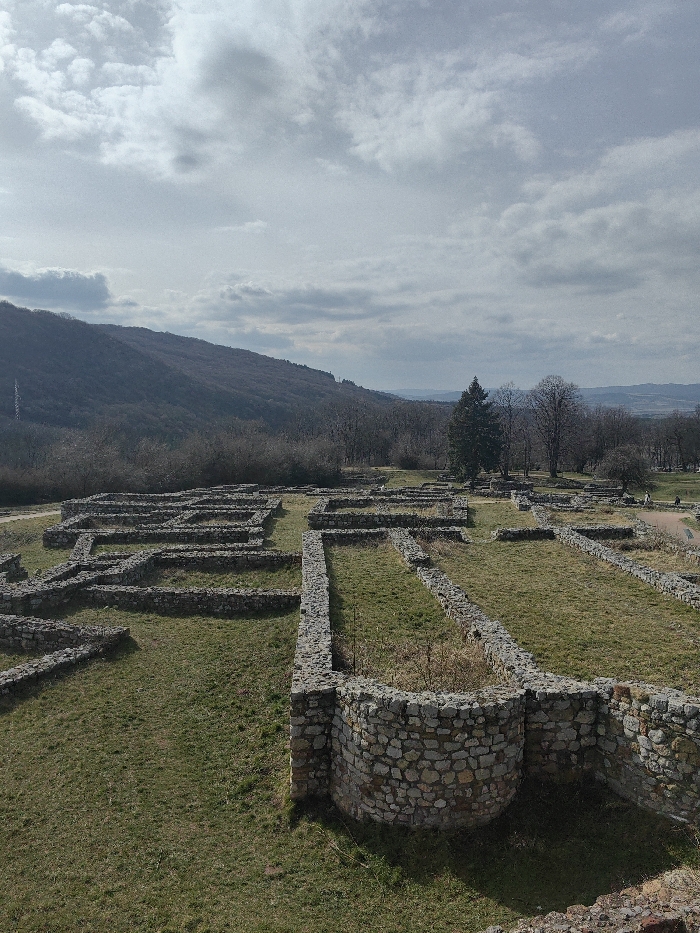 The image displays an archaeological site identified as the Pernik Fortress in Pernik, Bulgaria