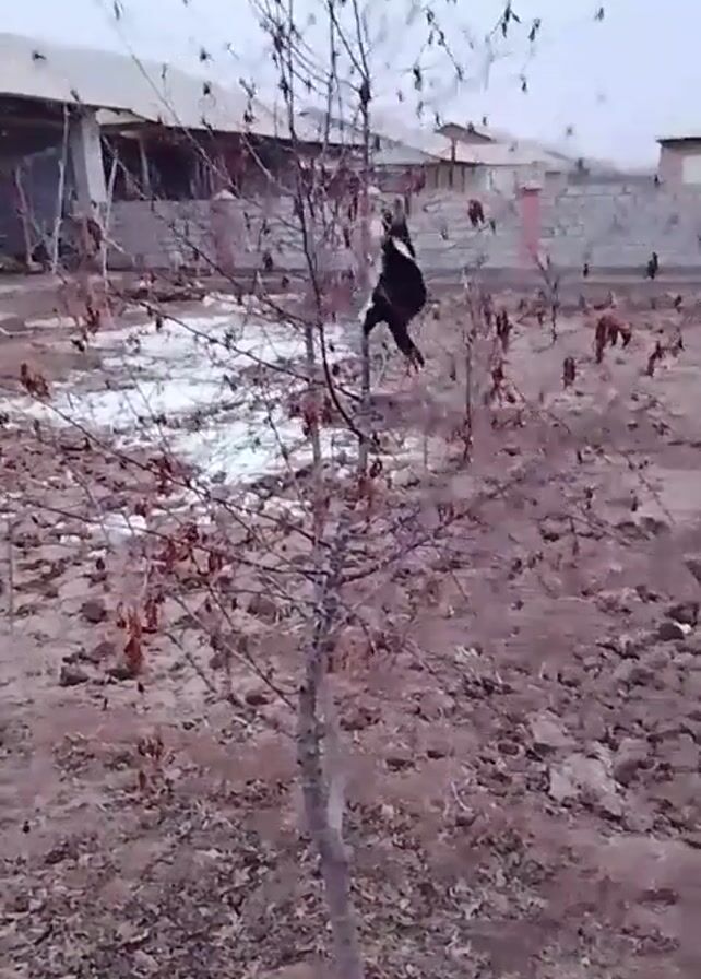black and white cat climbing a small, bare tree. The tree stands in a dirt yard with patches of snow. A building with a corrugated metal roof is visible in the background, along with a brick wall. The sky is overcast. The cat moves around the tree branches.