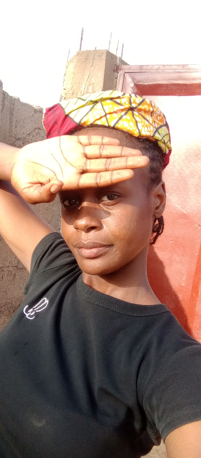 An individual is depicted in a close-up, waist-up, selfie-style photograph taken outdoors in Akwanga, Nigeria. The subject is a female with dark skin, wearing a black crew-neck t-shirt with a white abstract wing-like emblem on the left chest, and a multi-colored headwrap featuring red, yellow, white, and black patterns. Her hair appears styled in small braids or dreadlocks. She is shielding her eyes from direct sunlight with her raised right hand, creating a shadow across the upper portion of her face. Her left arm is visible to the left of the frame. The subject gazes directly into the camera with a neutral expression. The background on the left consists of a light brown, rough-textured concrete wall. On the right, a reddish-orange wall or door is visible, showing a dark metal frame near the top. Above the subject's head, an overexposed, bright white sky is visible, with glimpses of concrete structure and rebar protruding from a wall section in the upper left. Strong sunlight illuminates the scene, casting distinct shadows.