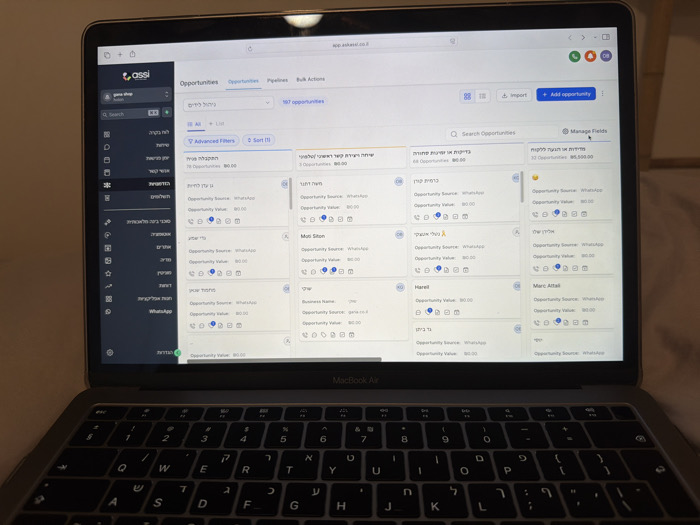 A silver MacBook Air laptop is displayed from a slightly elevated frontal perspective, its screen illuminated and showing a web browser. The URL in the address bar is `app.assi.co.il`. The screen content depicts a web-based application, likely a customer relationship management (CRM) system, focused on an "Opportunities" dashboard. The interface is predominantly in Hebrew, featuring a left-hand navigation sidebar with the "assi" logo, and the main content area divided into multiple columns representing stages (e.g., "התקבלות" - "Receipt", "מכירות וניהול לקוחות" - "Sales and Customer Management"). Within these columns are individual opportunity cards, each listing a name (e.g., Marc Siton, Harel, Moti Siton, Marc Attali), "Opportunity Source: WhatsApp," and "Opportunity Value: ₪0.00." Above the columns are options like "Add opportunity" and "Manage Fields." The laptop's keyboard, partially visible, features a QWERTY layout with additional Hebrew characters. The environment is an indoor, dimly lit setting, causing reflections on the screen. Based on the `.co.il` domain, the company Assi is located in Israel, with operations likely centered in Tel Aviv. No individuals are present in the image.