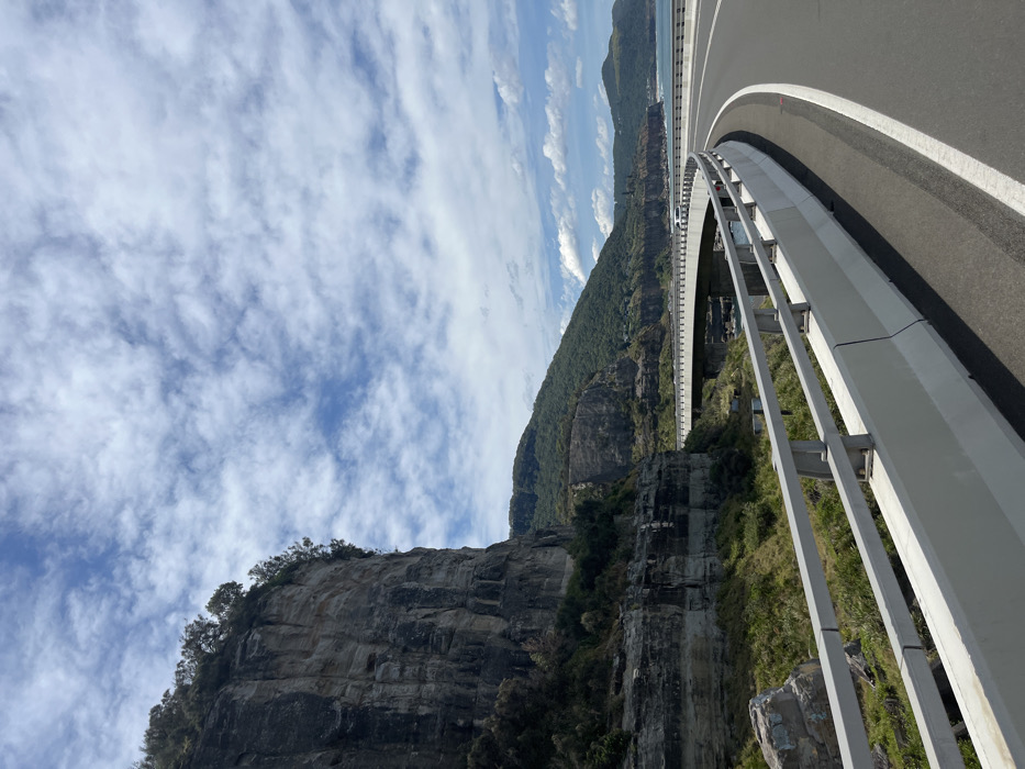 An elevated road curves through a scenic landscape, with its barriers dominating the right side. Below the road, a steep, rocky cliff face meets lush green vegetation that ascends toward a dense forest. Beyond the forest, a glimpse of the sea is visible under a sky filled with scattered clouds. The orientation of the photograph creates a dramatic, tilted perspective, emphasizing the height and depth of the scene.