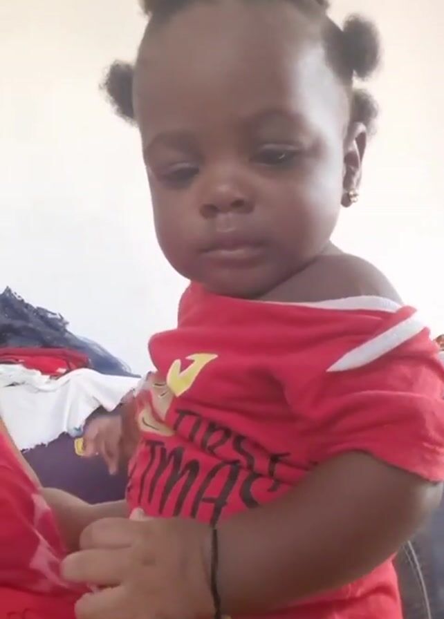 A baby with a dark complexion and dark hair arranged in small buns atop her head is the focal point of this close-up shot. She is wearing a red T-shirt, partially off her shoulder, revealing a white undershirt. She is also wearing a bracelet with beads on her left wrist, and a small earring on her left ear is visible. The baby is looking down, her expression somewhat solemn. Behind the baby, the background includes a glimpse of bedding and clothing, suggesting a casual, home environment. The backdrop is an off-white or light-colored wall. The camera angle is slightly above the baby, looking down at her. The lighting is even and does not cast strong shadows.