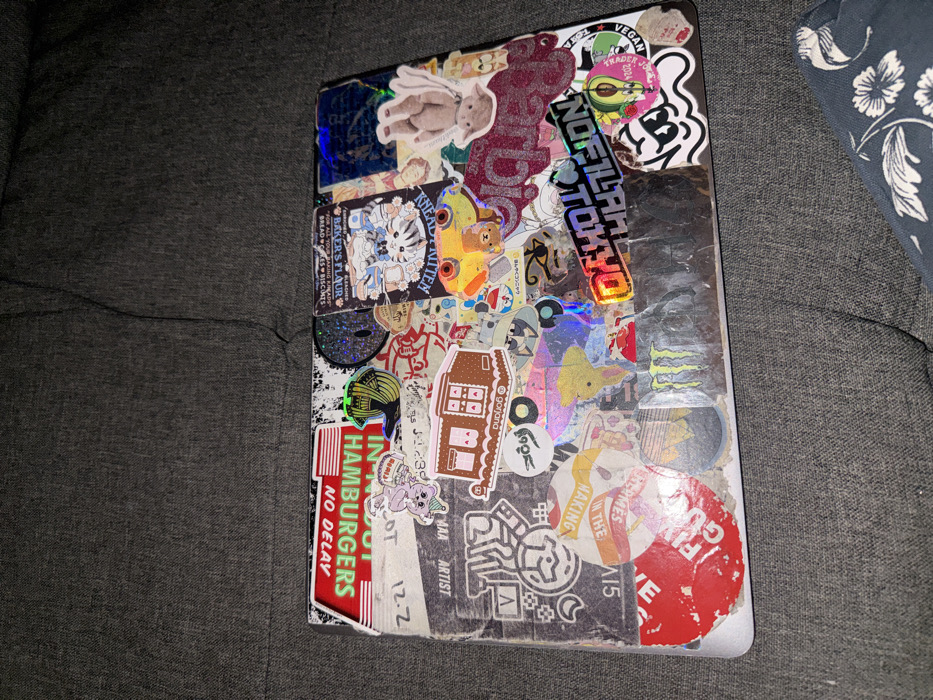 - "A laptop cover densely covered in various stickers" by FM-YrxjE3, licensed under CC BY 4.0