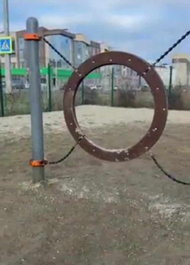 A black and white puppy leaps through a suspended circular hoop in an outdoor dog park. The hoop is attached to two metal poles with chains. The ground is gravel. In the background are apartment buildings, a road, and trees. The sky is overcast.