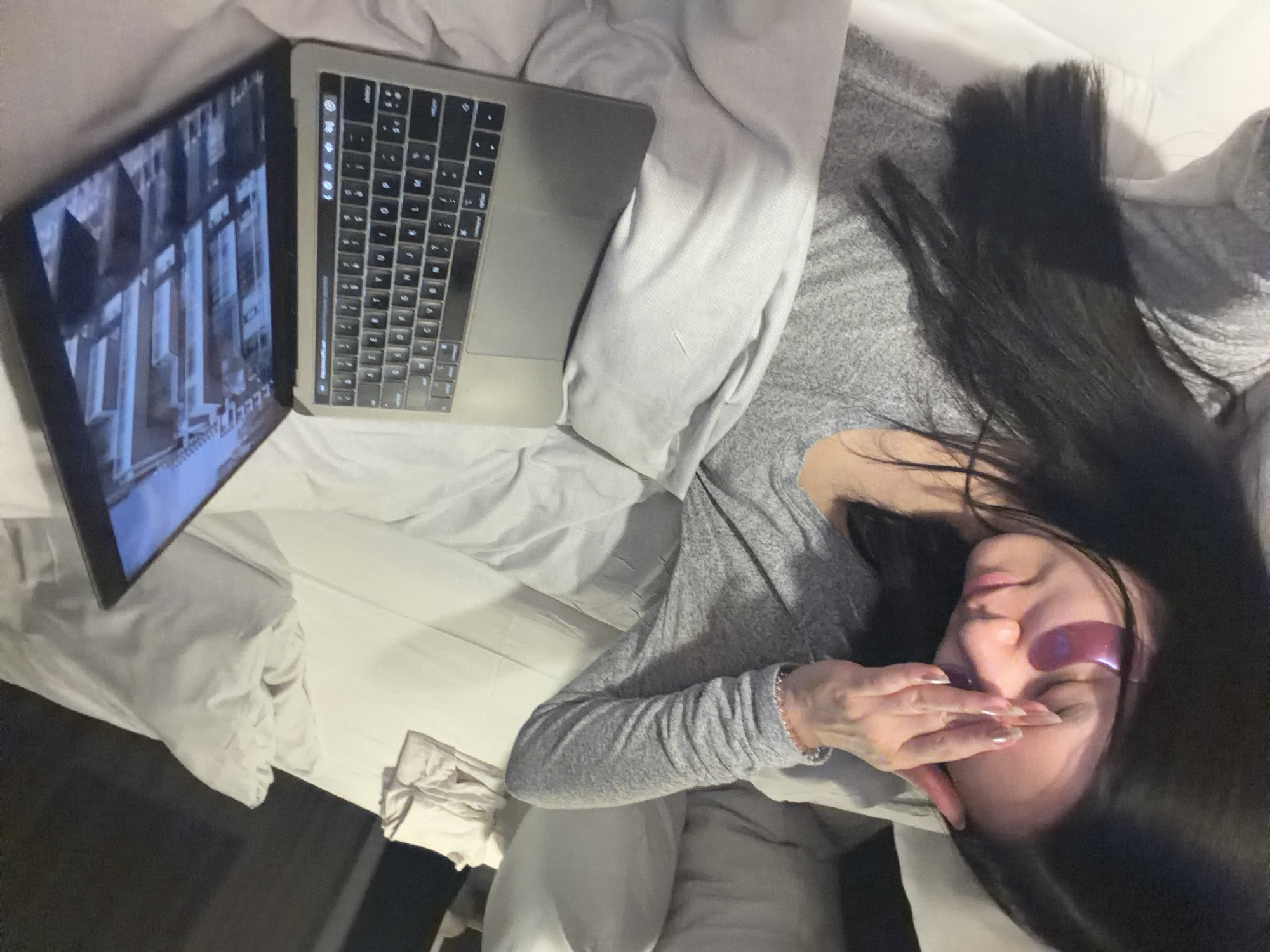 A female subject is depicted lying supine in a bed covered with white linens. She has long, dark hair and is wearing a grey long-sleeved garment. Purple hydrogel eye masks are applied beneath her eyes. Her left hand is positioned against her forehead, with fingers touching her temple and the edge of the eye mask. Her nails are light-colored. A light-colored chain-link bracelet is visible on her right wrist. To the right of the subject, a silver-colored laptop computer is open on the bed. The laptop screen displays a building with prominent vertical rectangular windows and a reflective facade, specifically identifiable as the "Grüner Kubus" of the Alfried Krupp Wissenschaftskolleg, located in Essen, Germany. White pillows and a stack of folded light-colored fabric are also visible in the background. The scene is an indoor setting, consistent with a bedroom or hotel room environment.