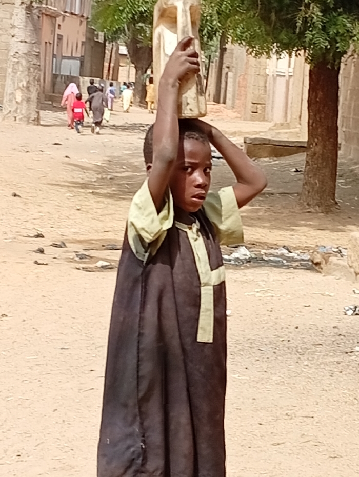- "A child in a traditional brown and light green robe carries a large, light-colored plastic container on their head" by FM-TtYM52, licensed under CC BY 4.0