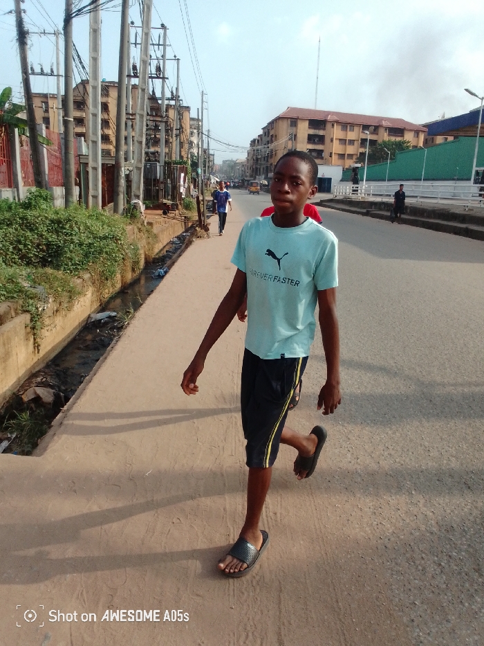 A young person walks along a street. The individual is wearing a light blue shirt with black shorts and sandals. A drainage ditch filled with debris separates the sidewalk from the street. Buildings line the street, with electrical poles and wires running along the side. People can be seen walking in the distance on the roadway. A concrete barrier stretches along the other side of the street.